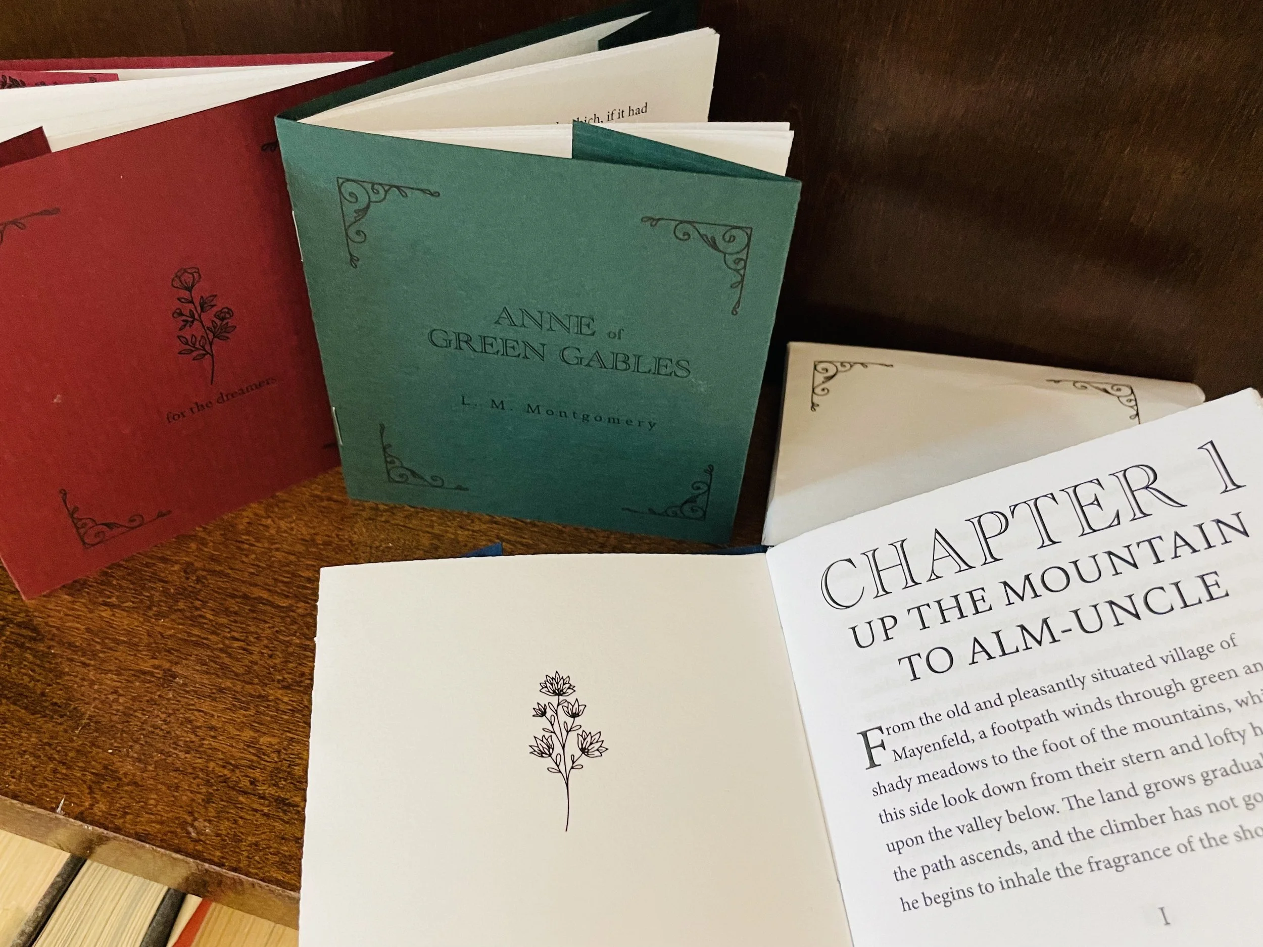 Here I have an example of a marketing piece a bookstore or similar business could use as a relatively inexpensive means of advertising books. Using stories that are in the common domain, I created a set of three mini-books with matching covers and type layouts. Each cost just pennies to produce, making them relatively inexpensive but engaging marketing pieces.